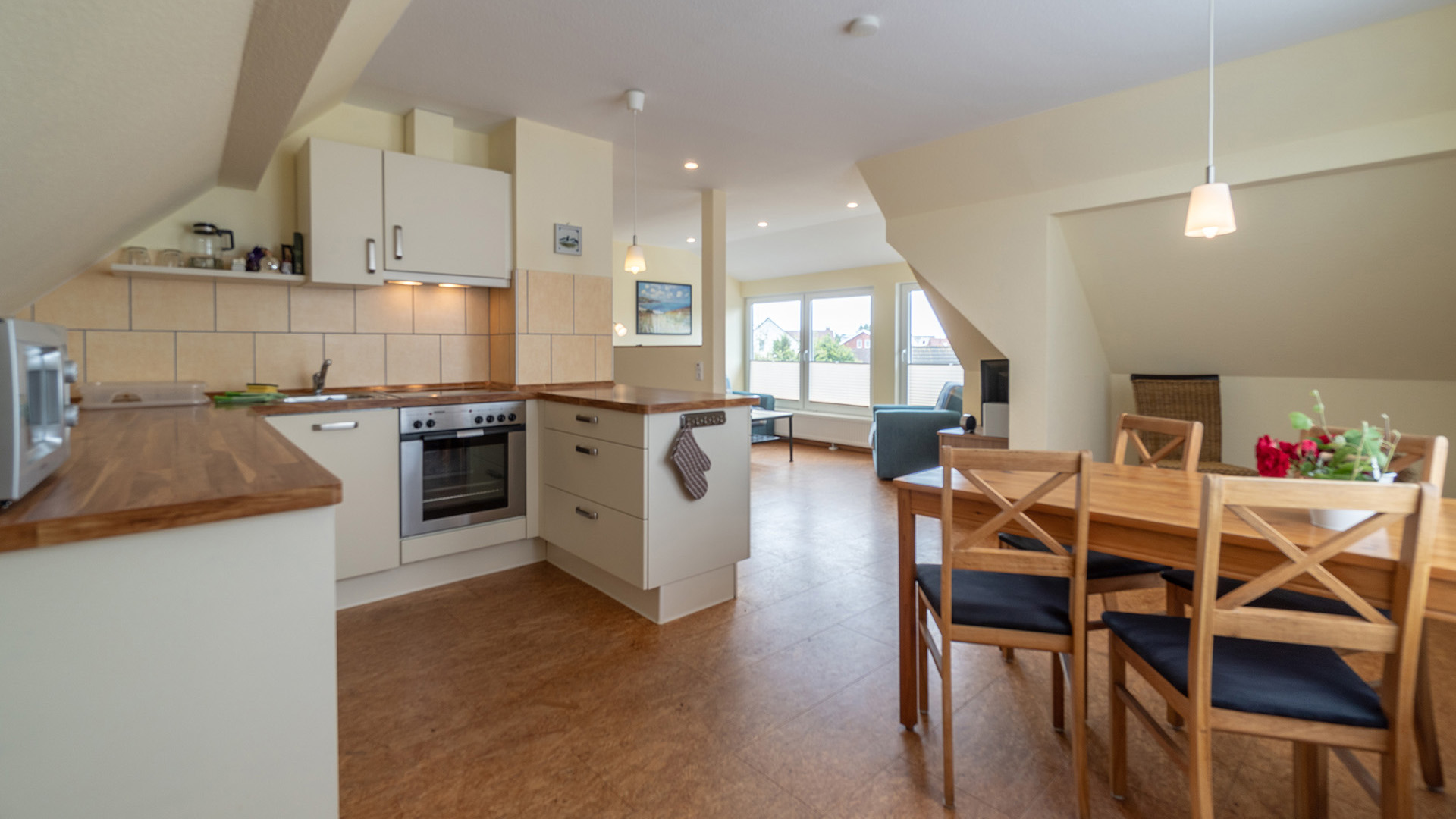 Im Dachgeschoss liegt unsere beliebte Wohnung „Utkiek“ für 1-2 Personen. Sie lädt mit ihrer großzügiger Fensterfront im Wohnbereich und herrlichem Blick auf den Neuen Leuchtturm geradezu zur Teestunde bei ungemütlichem Wetter ein. In der gut ausgestatteten Küche lässt es sich entspannt Kochen. Und falls nicht alle Fernsehen wollen, kann man sich in die bequeme Leseecke zurückziehen. Im Schlafzimmer mit Doppelbett und separatem Einzelbett ist erholsamer Schlaf auf hochwertigen Taschenfederkernmatrazen mit Komfortschaum möglich. Die Matratzen sind mit Milbenschutzbezügen ausgestattet und ein Insektenschutz-Gitter am Fenster bietet Schutz vor den Plagegeistern.