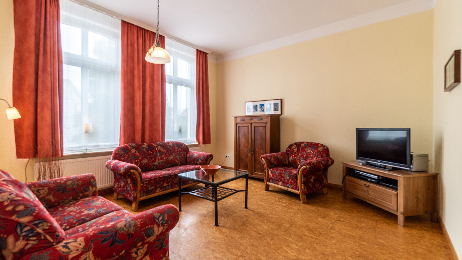 Die Wohnung „Middeldeele“ für 1-4 Personen plus Babybett liegt im 1. Stock unseres Hauses. Von der geräumigen Küche blicken Sie auf den Neuen Leuchtturm und den Krieger-Denkmalplatz. Das Schlafzimmer mit Massivholzmöbeln und Doppelbett (180 x 200 cm), mit hochwertigen Taschenfederkernmatratzen (mit Komfortschaum ummantelt), trägt zu einem erholsamen Schlaf bei. Im zweiten Schlafzimmer stehen zwei Einzelbetten, die auf Wunsch zusammengestellt werden können. Im Wohnzimmer, ebenfalls mit Blick auf den Krieger-Denkmalplatz, kann man es sich auf zwei Ledersofas zum Ausruhen und Fernsehen bequem machen. Bücher und Gesellschaftsspiele sind vorhanden. Auch in dieser großzügig geschnittenen Wohnung finden Familien oder Paare ausreichend Platz für schöne Urlaubstage – selbst, wenn das Wetter mal nicht mitspielt.