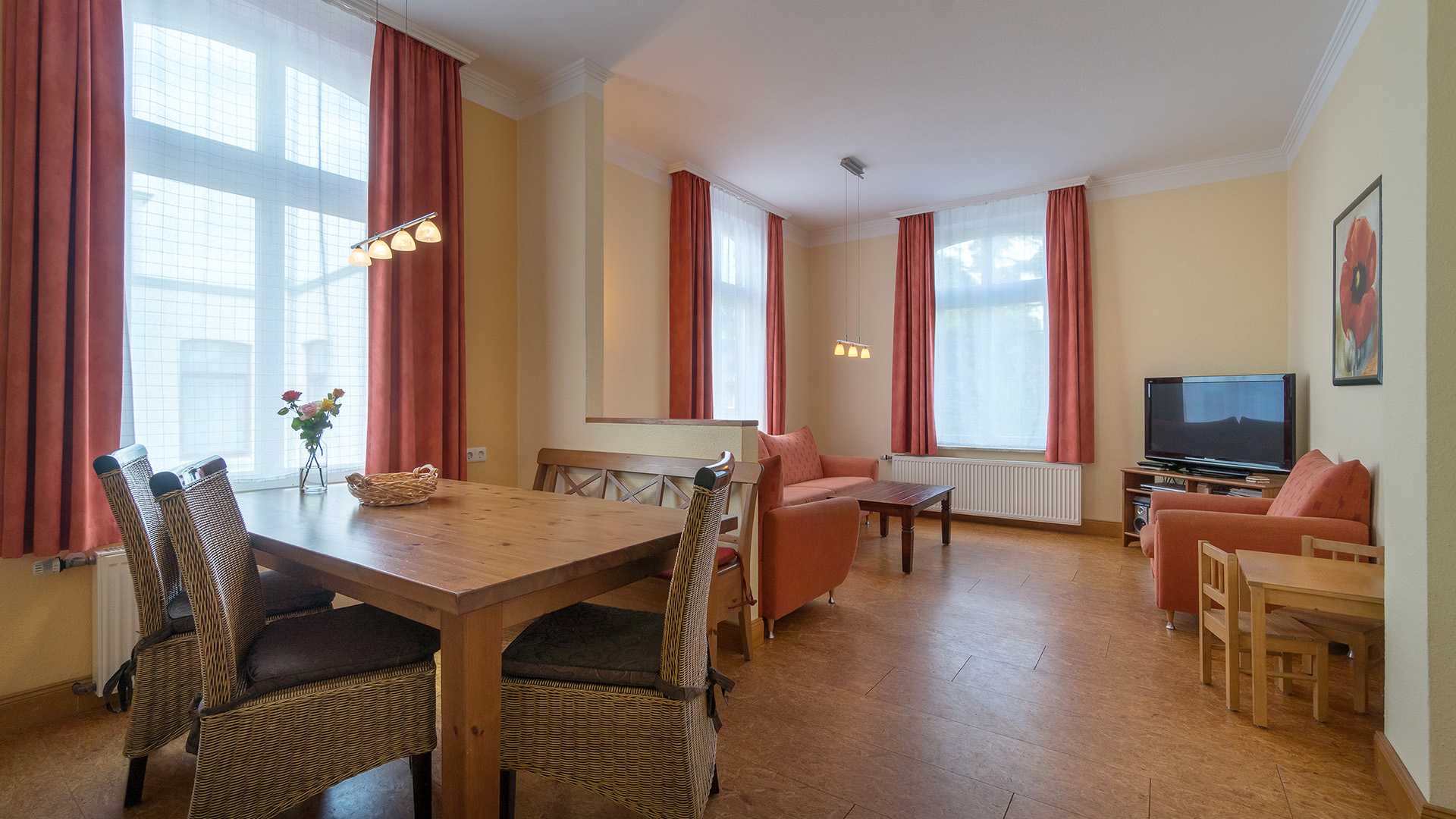 Unsere größte Wohnung „Achterut“ bietet auf 95 qm mit drei Schlafzimmern auch größeren Familien oder bis zu 3 Paaren ausreichend Raum für erholsame Ferientage. Sie liegt im 1. Stock des Haus Gerrit Müller. Treffpunkt ist die große Wohnküche mit halb abgeteilter Sofa-/Fernsehecke. Die Küchenzeile enthält alles, was für das gemeinsame Kochen und Essen gebraucht wird. Die zwei Doppelschlafzimmer sind geräumig und bieten auch noch Platz für ein Babybett. Im Kinderzimmer mit zwei Einzelbetten steht ein Kinderbett 140 x 70 cm, die Kommode kann zum Wickeltisch umfunktioniert werden. Im großen Bad mit zwei Waschbecken, Dusche und WC ist viel Platz und genügend Abstellfläche/Haken für alle Badutensilien. Zusätzlich gibt es noch ein separates WC. Die Wohnung ist in hellen Farben gehalten und überwiegend mit Massivholzmöbeln eingerichtet. Der gewachste Holzfußboden trägt zum natürlich-behaglichen Eindruck bei.